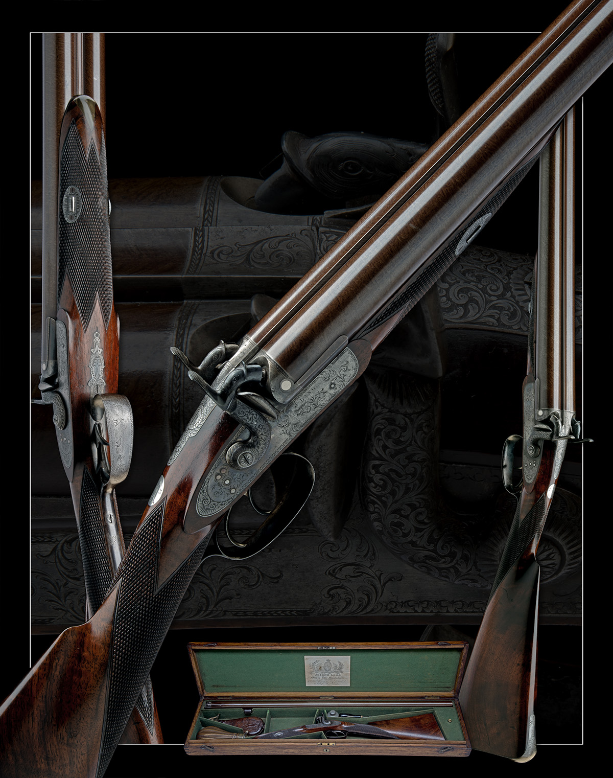 completed in 1865, with browned 36in. damascus barrels, the top-rib signed 'J. LANG, COCKSPUR STREET, LONDON', bead fore-sight, colour hardened breech-blocks with engraved rib-end, engraved band and platinum plugs, fully scroll engraved top-tang, border and scroll engraved colour hardened locks signed along the bars 'J. LANG', scroll engraved dolphin-headed hammers, chequered walnut half-stock, the wrist with an engraved escutcheon featuring a standing figure holding a corn-flail aloft below the motto 'Now Thus', iron furniture, the trigger guard bow with a scene of capercaillie and no provision for ramrod, retaining much period finish and colour and in its maker's oak case, lined and compartmented in green baize and including a flask, shot flask, two nipple-keys and an oil-bottle
