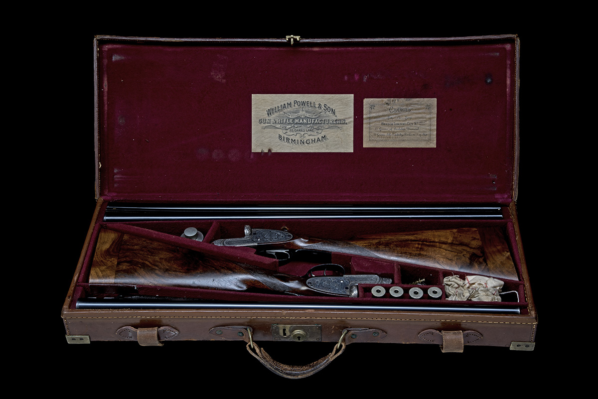 circa 1935, 27in. nitro reproved chopperlump barrels (in 1978), ribs engraved 'WILLIAM POWELL & SON. 35. CARR'S LANE. BIRMINGHAM. SIR JOSEPH WHITWORTH'S FLUID PRESSED STEEL' and gold-inlaid '1' and '2' at the breech ends, 2 1/2in. chambers, bored approx. imp. cyl. in all, slender W. Baker patent assisted-opening actions, patent no.16778 of 22nd March 1913, with Baker patent ejectors, toplevers gold-inlaid '1' and '2', automatic safeties with gold-inlaid 'SAFE' details, fine acanthus scroll engraving with floral bouquets, the fences carved in high relief with foliate designs on a matted background, retaining traces of colour-hardening, 15 1/4in. stocks including 1 5/8in. wooden extensions, small crack towards rear of safety No. 2, weight 6lb. 3oz. (No.1) and 6lb. 4oz. (No.2) in their brass-cornered leather case
