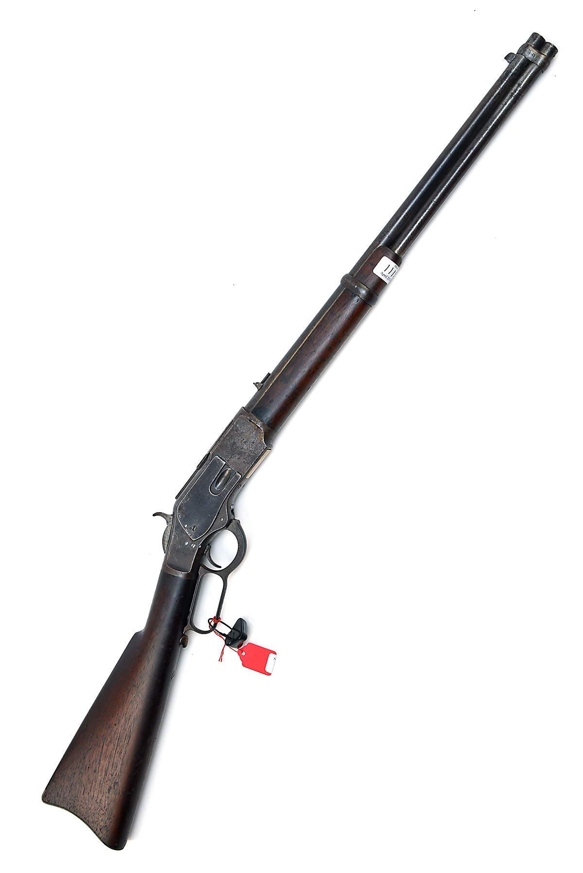 for 1881, with round 20in. barrel, the top signed by the maker and with patent dates of '1866' & '1860' and further signed 'TRULOCK & HARRISS, 9 DAWSON ST. DUBLIN', block and blade fore-sight, twin blade 'L' shaped carbine rear-sight, period London proofs, the receiver with further signature from the retailer to the left side, loading port to the right, automatic retracting dust-cover with applied guide-rail to receiver top, exposed hammer, top-tang without provision for a peep-sight and marked 'MODEL 1873', loose saddle-ring, walnut butt, the iron carbine heel-plate with central trap containing the original dismountable cleaning rod, brass cartridge lifter, walnut fore-end with single barrel band and full-length magazine with further band at nose, traces of finish