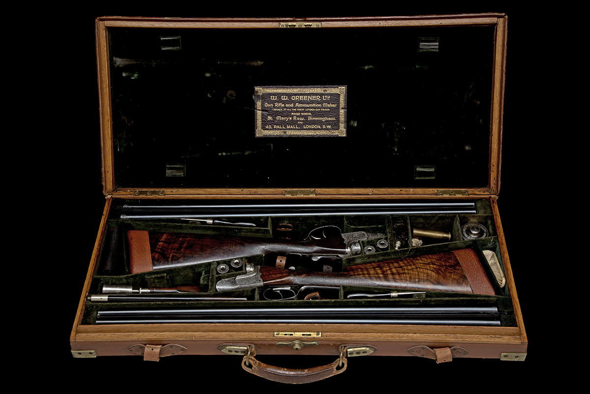 No.2 with 28in. Greener trade mark nitro replacement barrels (in 1955), scroll engraved at the breech ends, rib gold-inlaid '2' and engraved 'W. W. GREENER. MAKER. 40 PALL MALL. LONDON. WORKS BIRMINGHAM.', 2 1/2in. chambers, bored approx. 1/4 and 3/4 choke, scroll-back treble-grip actions with arcaded fences and side shoulders, toplevers gold-inlaid with a crown and '1' and '2', automatic tang safeties with gold-inlaid 'SAFE' details, rolled-edge triggerguards, possible repairs to tangs, action flats with minor cracks at bridges, bold acanthus scroll engraving interspersed with ears of wheat, oak leaf bordering and with game scene vignettes of hound and fowl, the triggerguards with hounds retrieving rabbits, 15in. highly-figured stocks (setting cracks to rear of top tangs) with decorative horn inserts at the drop points, including 1 1/2in. leather covered extensions, fore-ends with Deeley & Edge patent release catches, gold-inlaid '1' and '2', horn spearpoint finials and ornate chequering borders, weight 6lb. 8oz., in a brass-cornered oak and leather case with green velveteen lining, gold-tooled black pigskin leather label and some accessories