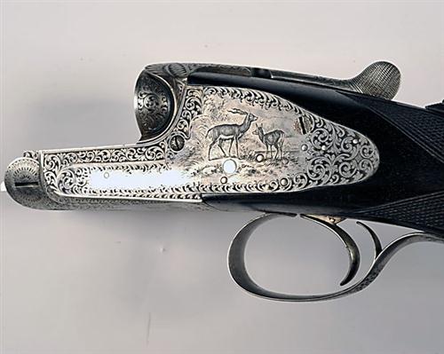 23 3/8in. nitro reproved barrels with broad matt sight rib, engraved in gothic script 'JOHN RIGBY & CO. 72 ST. JAMES'S. LONDON.', with open sights and two folding leaf sights for 100, 200 and 300 yards with inlaid sighting lines, ramp-mounted bead fore-sight, the breech end mounted with a Zeiss Diatal C 1,5x12 telescopic sight in quickly-detachable mounts, treble-grip action incorporating J. Rigby and T. Bissell patent rising third bite, patent no. 1141 of 1879, use number 958, carved leaf fences, removable striker discs, manual safety with push button release and gold-inlaid 'SAFE' detail, dipped-edge lockplates, non-selective single trigger, the action, lockplates and furniture carved in high relief with bold acanthus scrollwork on a matt background, the toplever with the head of a tiger, the sideplates with game scenes of Kashmir stag and blackbuck, the underside with a pair of leopards, the triggerguard with a sambar, the lockplates gold-inlaid in gothic script with the makers name, retaining very slight traces of original colour-hardening, 14 3/8in. well-figured pistolgrip stock with horn pistolgrip-cap, sling swivels, gold escutcheon with a crest of the sun in his splendour, including 7/8in. rubber recoil pad, fore-end with grip-catch release lever and ejector / non-ejector selector nut, weight 10lb. 10oz., in its brass-cornered oak and leather case with some accessories