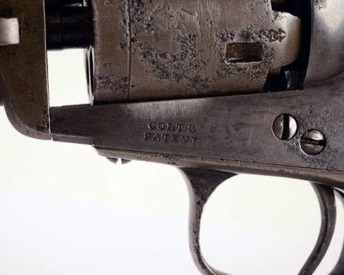 for 1854, with 6in. octagonal barrel, the top-flat signed 'ADDRESS COL COLT LONDON' surrounded by brackets with arabesque terminals, bead fore-sight, plain cylinder with roll-engraved 'stagecoach hold-up' scene, open iron frame, iron grip-straps and trigger-guard, one-piece smooth walnut grip and articulated under-barrel rammer COMPLETE WITH a renovated American market mahogany storage case, compartmented and lined in blue velvet and an American Eagle style powder flask