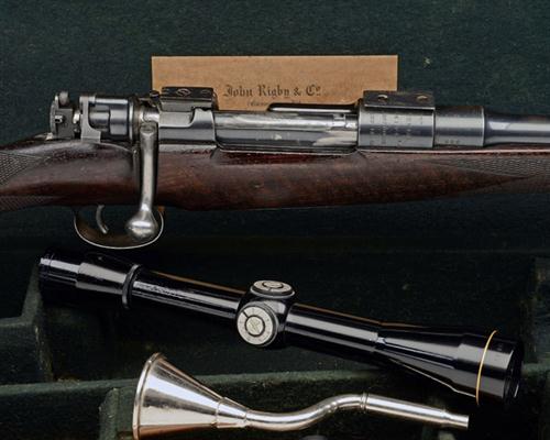 25in. nitro barrel engraved in gothic script 'JOHN RIGBY & CO. 43 SACKVILLE ST. LONDON', two folding leaf sights marked for 100 and 300 yards, ramp-mounted bead fore-sight, receiver (with thumb cutout) fitted with bases for Sako telescopic sight rings, Leupold 'M8' 6x telescopic sight, Rigby patent cocking-piece peep-sight, figured pistolgrip stock, gold escutcheon engraved 'J.C.M-L', 14 1/4in. pull including steel buttplate, in its brass-cornered canvas full length Rigby rifle case with trade label and accessories including cleaning funnel, the lid named 'J. GODMAN / SCOTS GUARDS'.