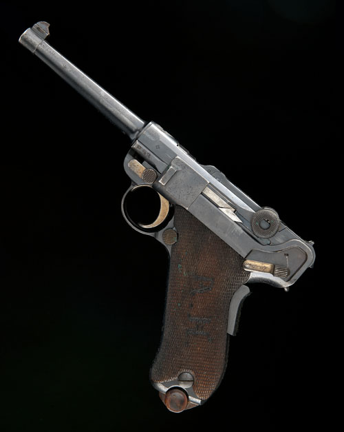 circa 1909, with 4 3/4in. sighted barrel (proved 2011), 'Swiss' shield engraved to top of breech, bolt marked 'DWM', frame marked 'P53', chequered wooden grips initialled 'A.H' on the left and carved with a 'Swiss' cross on the right, grip-safety, wood based magazine, matching numbers, the whole retaining much original blued finish (some light corrosion speckling) and a good amount of original straw finish, TOGETHER WITH its original brown leather flap holster with shoulder-strap stamped 'E. SCHMUTZ NEUVEVILLE' and '17'.