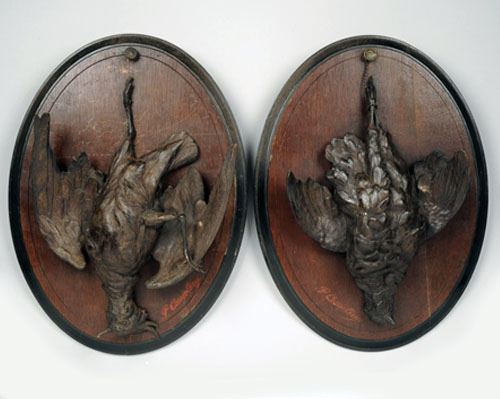 A PAIR OF BRONZE HANGING GAME SIGNED P. COMOLERA,