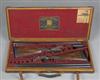 28in. sleeved nitro reproved barrels, ribs re-engraved 'J. PURDEY & SONS. 314 1/2, OXFORD STREET. LONDON. MADE OF SIR JOSEPH WHITWORTH'S FLUID-PRESSED STEEL' and scroll engraved at the breech ends, 2 3/4in. chambers, bored approx. 1/4 and 1/2 choke, self-opening actions with striker discs, carved fleur-de-lys fences, automatic safeties with gold-inlaid 'SAFE' details, arrow cocking-indicators, best bouquet and scroll engraving, retaining virtually full renewed colour-hardening and finish, 15 1/2in. well-figured stocks including 1 1/2in. leather-covered recoil pads, weight 6lb. 11oz., in a Holland & Holland brass-cornered oak and leather case. The makers have kindly confirmed that the guns were completed in July 1882 as non-ejector guns.