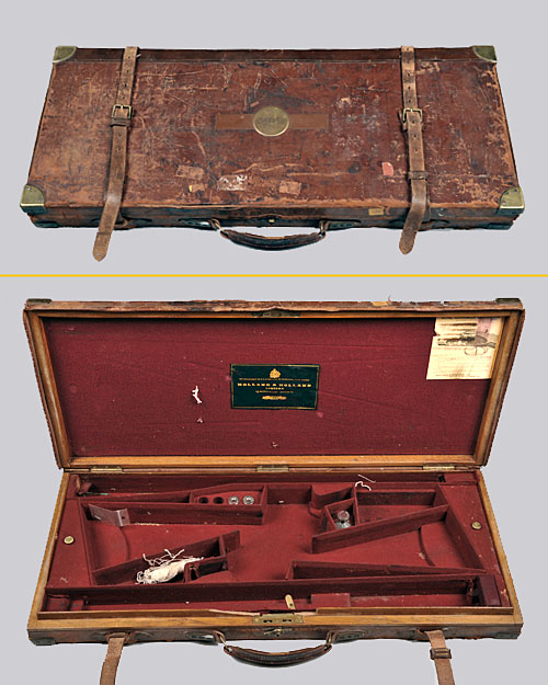 fitted for 29in. barrels (would adapt to 30in.), red baize lined interior (partially re-lined, wood damaged near lock) with Holland & Holland snap-caps and oil bottle, lid with circular brass escutcheon initialled 'HGH' (leather worn, hinge repaired).