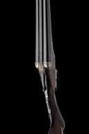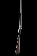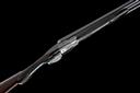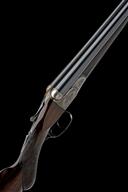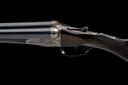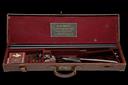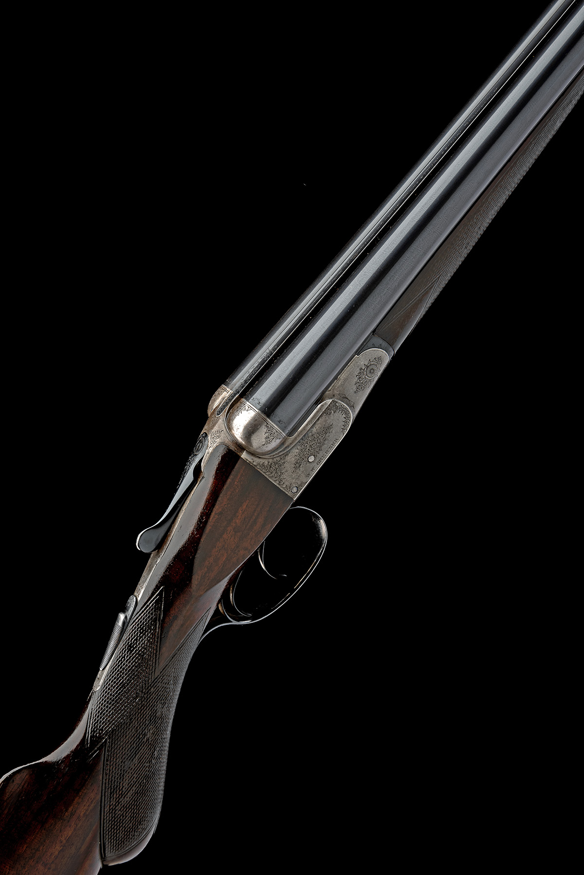 for 1910, 30in. blacked damascus nitro barrels, the rib engraved 'W.W. GREENER. MAKER. 68 HAYMARKET LONDON. WORKS. ST. MARY'S SQUARE. BIRMINGHAM.' and with acanthus scroll detailing at the breech end, 2 1/2in. chambers, bored approx. 1/4 and 1/2 choke, treble-grip action with short side bolsters, automatic safety with gold-inlaid 'SAFE' detail, acanthus scroll engraving, retaining very slight traces of original colour-hardening and much renewed finish, 14 3/4in. figured semi-pistolgrip stock including horn buttplate, fore-end with Deeley & Edge release catch and horn finial, weight 5lb. 10oz., in its brass-cornered leather guncase