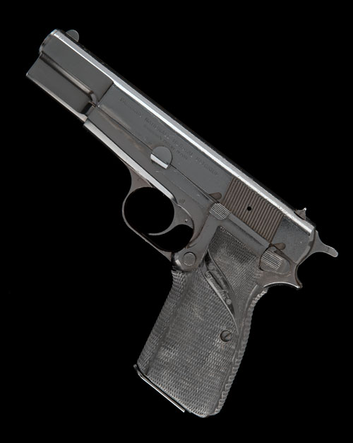 circa 1977, with 4 3/4in. barrel, blued sighted slide marked 'FABRIQUE NATIONALE HERSTAL BELGIQUE', blued frame with rear-mounted lift-up safe and 'Pachmayr' soft rubber chequered grip, the whole appearing little used