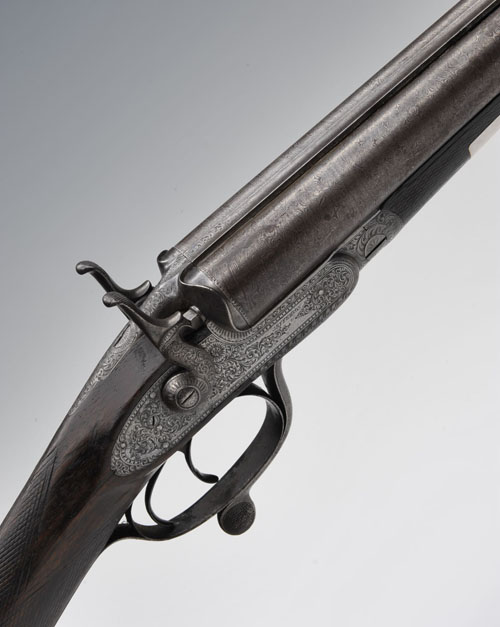 J. JEFFERSON 12-BORE ROTARY-UNDERLEVER HAMMERGUN, serial no. 2100, converted from muzzle-loader, 30in. nitro reproved damascus barrels (lower rib loose), top rib engraved 'J. JEFFERSON SCARBRO', 2 3/4in. chambers, bored approx. true cyl. in both, Jones patent rotary-underlever, slender carved serpentine fences, non-rebounding locks with hammers of hare's ear form, border and acanthus scroll engraving, brushed bright, 14 1/2in. stock with engraved steel heel and toe plates