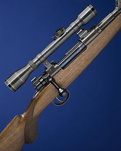 24in. nitro barrel, ramp-mounted bead fore-sight, block-mounted rear-sight of one standing and two folding leaves calibrated 100, 200 and 300 yards, each with inlaid centre-line, the receiver mounted with an Oigee telescopic sight in quick detachable mounts, 13 3/4in. semi-pistolgrip stock including 3/4in. rubber recoil-pad, cheekpiece