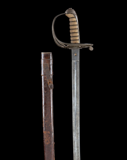 circa 1900, with slightly curved 32 1/2in. blade, etched for the first four-fifths of its length with floral scrolls, a Victorian crown and infantry bugle, the reverse with two vacant banners, makers mark etched at ricasso (very rubbed, nearly illegible) serial no. to spine with stamped 'WSC' monogram, iron half-basket with Rifle Regiment bugle and crown, iron backstrap and pommel, sharkskin wire-bound grip TOGETHER WITH its leather field scabbard with iron mounts (lightly worn)