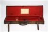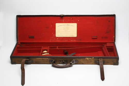 A BRASS CORNERED CANVAS & LEATHER SINGLE GUNCASE, fitted for 28in. barrels (could adapt to 30 in. barrels), line with red baize, straps & handle good, brass lock (key missing), supporting a Stephen Grant trade label