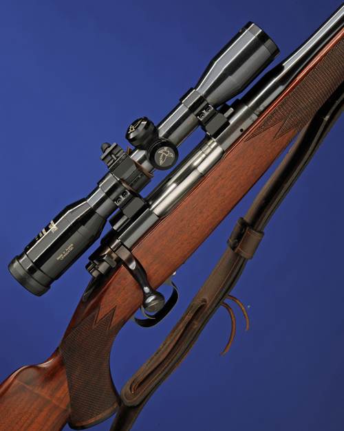 58cm. blued nitro Shilen chrome hand lapped barrel (1:14 twist), blued receiver fitted with a Swarovski 'Habicht' 4x32 Nova telescopic sight in Apel roll-off mounts, Jewell stainless trigger, 14 1/8in. figured pistolgrip stock including 1in. leather-covered recoil-pad, raised cheek-piece, chequered grip and fore-end, darn horn pistolgrip-cap and fore-end cap, silver escutcheon engraved with the initials 'M.G.P.', blued mounts including magazine floor-plate engraved with a roe buck's head, blued sling mounts, brown leather sling.
