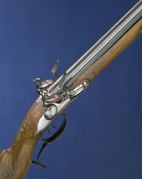 third quarter of the 18th century, with 28in. barrels signed 'IN BAMBERG FERDINAND ECKARD' in silver at the breeches and struck with maker's marks, silver fore-sight, grooved tang, rounded locks respectively signed 'FERDINAND ECKARD' and 'IN BAMBERG', walnut half-stock carved in low relief with scrollwork behind the barrel-tang and with a woodland scene involving a hound chasing down a boar on the right side and a stag behind the raised cheek-piece on the left side, the cheek-piece heightened with applied brass scrollwork and inlaid with a bone and dark wood star, brass mounts including butt-plate with faceted tang (trigger-guard repaired), faceted brass ramrod-pipes, iron sling mounts, and later brass-mounted ramrod.