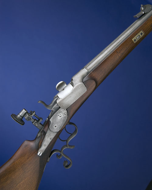 72cm. barrel with full length raised sighting flat, bead fore-sight, sprung tangent rear-sight, breech marked 'OE / WG', plain back-action lock, 12 1/4in. walnut half-stock with raised shaped cheek-piece and chequered grip (cracked and pinned behind the left side of the breech), the wrist fitted with an adjustable aperture rear-sight, set triggers, scrolled iron trigger-guard, and hooked iron butt (iron parts cleaned).