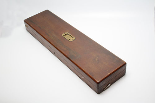 A MID 19TH CENTURY MAHOGANY GUNCASE WITH BRASS HANDLE IN LID,