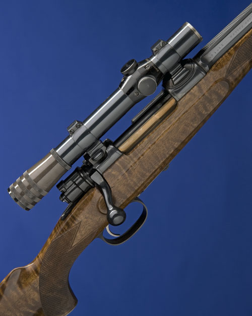 22 1/4in. blued nitro octagonal to round barrel signed 'JOSEF ZELLER' and 'PADERBORN', full length matt raised sighting rib, bead fore-sight, rear-sight of one standing and one folding leaf, blued border engraved receiver fitted with a Hensoldt 2 1/2x52 telescopic sight in quick detachable mounts, 14 3/8in. well figured replacement pistolgrip stock with raised cheek-piece, chequered grip and schnabel fore-end, border engraved blued mounts including magazine floor-plate with lever locking-catch, case-hardened skeletal butt-plate, sling mounts, older reblued finish.