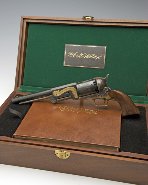 No. 848 of a limited edition of 1850 cased sets, with 9in. blued sighted two-stage black powder only barrel signed 'ADDRESS SAM.L COLT NEW-YORK CITY' on the top flat, the barrel-block with scroll engraved gold-inlaid ribbon on the left side signed 'THE COLT HERITAGE COMMEMORATIVE' and a scroll engraved ribbon on the right side marked 'US / 1847' with two engraved gold-inlaid portrait busts, one of Samuel Walker and the other of Samuel Colt, blued cylinder with roll engraved Texas Rangers scene, 'MODEL U.S.M.R.' and 'COLT'S PATENT', case-hardened frame marked 'C-COMPANY NO. 848', blued iron grip-strap, brass trigger-guard, figured one-piece walnut grips each with 'inspection mark', case-hardened rammer, in original fitted mahogany case lined with dark green velvet, the case with lift-out black velvet lift-out tray with a signed copy of the limited edition book 'The Colt Heritage' (No. 848 of 1850 copies) by R.L. Wilson, with keys. This revolver appears to be in as new condition.