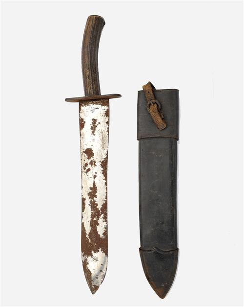 by Paget of 195 Piccadilly, London, circa 1850, with steel end-capped stag horn hilt, large flat steel cross guard (surface corrosion and patina), the substantial 13 3/4in. spear point blade double edged for the last 3in. (large areas of surface rust, blade polish on the remainder) makers details and V R with a crown on the left hand side near the cross guard, together with its original scabbard of blackend leather (rubbed), attached reinforced tip and frog with buckle securing strap and belt loop to the reverse.
