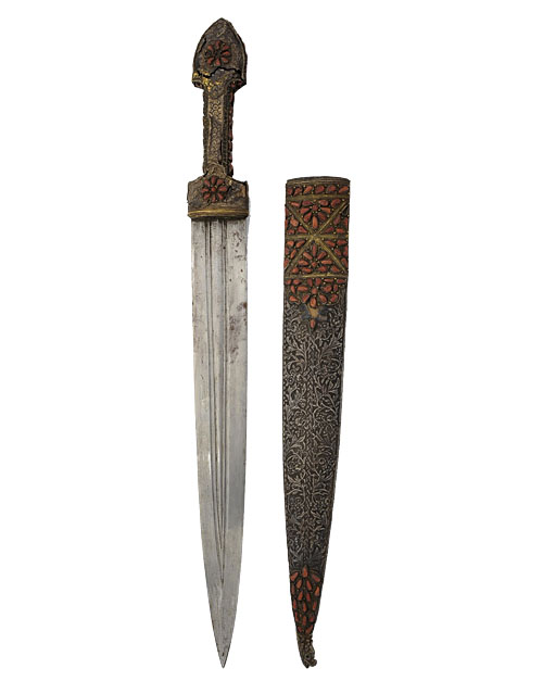 early 19th century, with white sheet metal beaten hilt over a wood core, fully decorated with wire-work and pink coral inlays of seed form (in fragile condition with losses and damage throughout), the 16 1/2in. wide double edged blade with central treble fuller, in its original white metal scabbard fully decorated en-suite with the hilt (minor losses to decoration), stylised fish head device to tip and small suspension loop to the reverse