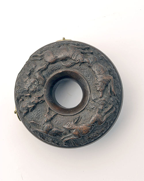 A CONTINENTAL CARVED WOODEN POWDER-FLASK OF 'DOUGHNUT' FORM, mid 20th century, possibly earlier, carved in the 'Black Forest' style with scenes of hares, boars and wolves, two brass suspension rings (possibly later), missing nozzle
