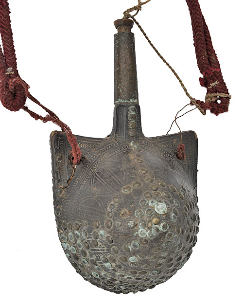 A MOROCCAN POWDER FLASK, mid 19th century, of conical form with a flat base and two squared corners pierced for a suspension rope (present), the body covered in a geometric pattern of brass tacks and an extended brass covered pipe with cork stopper