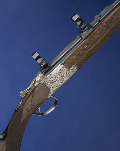 25 5/8in. nitro barrels with matt sight rib, flip-up open sights and ramp-mounted bead foresight, the breech end with 1 1/8in. telescopic sight rings in quickly-detachable mounts, three-piece fore-end, hold-open toplever, manual safety with integral barrel selector switch, bold floral and acanthus engraving on a matt background, signed 'F. PAUWELS', old silver finish, 14 3/8in. figured roachbelly stock, weight 8lb. 2oz.