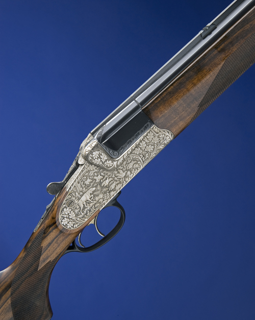 bolstered quadruple-grip action, hold-open toplever silver-inlaid with the initials 'PCS', manual safety, gold cocking indicators, set front trigger, engraved with scenes of dog flushing game, the bolsters engraved with foliate motifs on a matt background, 14 1/2in. well-figured pistolgrip stock with pistolgrip cap, including wooden buttplate, weight 8lb. 2oz. (combination barrels) and 7lb. 15oz. (shot barrels), in its brass-cornered case with provision for both sets of barrels