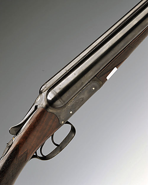 A. LANCASTER 12-BORE BOXLOCK NON-EJECTOR, serial no. 5168, 30in. nitro barrels (dented), 2 1/2in. chambers, bored approx. 1/2 and full choke, treble-grip action, automatic safety with gold-inlaid 'SAFE' detail, border engraving, blacked action, 14 1/2in. stock