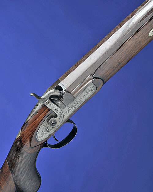 mid-19th century, with shortened 32 1/2in. rebrowned twist two-stage sighted barrel signed 'EBRALL SALOP' (signature worn) towards the breech, border and scroll engraved patent breech, border and scroll engraved tang, lock and mounts, figured walnut pistolgrip half-stock, chequered grip, horn fore-end cap, silver escutcheon engraved with a crest and motto, white metal barrel-bolt escutcheons, and later brass-tipped ramrod, (minor bruising to stock, some discolouration to iron parts throughout), Birmingham proof marks.