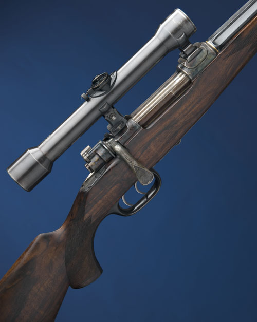 25in. blued octagonal to round nitro barrel (proved in 2009) with full length raised matt sighting rib signed 'CARL STIEFELE HOFGEWEHRFABRIK MUNCHEN' in gold and with gold-inlaid line at the breech, bead fore-sight, adjustable standing rear-sight, case-hardened border and scroll engraved receiver, fitted with a Zeiss 'Zielvier' telescopic sight in quick detachable tunnel mounts, 13 1/2in. figured pistolgrip stock including 3/4in. butt-pad, raised shaped cheek-piece, chequered grip and fore-end, set triggers, dark horn trigger-guard and pistolgrip-cap, case-hardened border and scroll engraved mounts including bullet-trap cover and magazine floor-plate, the last with lever locking-catch, sling mounts.