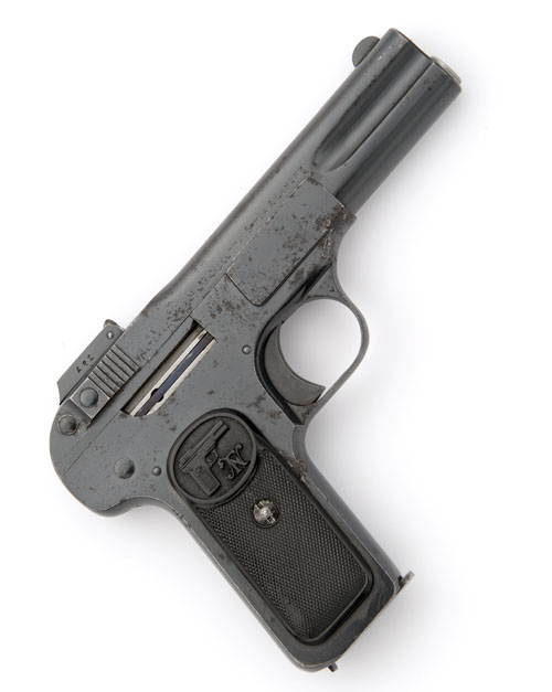 10cm. nitro barrel, blued slide marked with retailer's address 'WALTER LOCKE & CO. LTD. CALCUTTA, SIMLA & LAHORE' on the right side, blued frame (patch of corrosion in front of trigger-guard), and chequered black plastic grips with facsimile of the pistol and 'FN' monogram in the upper part of each grip, probably factory refinish throughout.