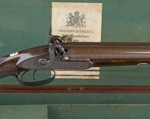 with 30in. rebrowned twist sighted barrels signed 'WESTLEY RICHARDS 170, NEW BOND ST. LONDON' (signature refreshed), border engraved patent breeches each with pierced platinum plug, border engraved tang and locks, the latter each signed 'WESTLEY RICHARDS', figured walnut half-stock with chequered grip, reblued iron mounts including border and scroll engraved trigger-guard, silver escutcheon engraved with a crest and silver barrel-bolt escutcheons, and original brass-mounted ramrod with worm, Birmingham proof marks, in brass-cornered mahogany case for gun number 5793, lined in green baize with accessories including brass-mounted copper Hawksley powder-flask, Sykes patent leather shot belt, pull-through and nipple-wrench, the lid with Westley Richards trade label, the exterior with flush-fitting brass carrying-handle and circular brass escutcheon.