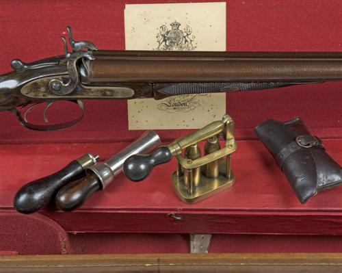 29 7/8in. slightly shortened browned twist sighted reproved black powder only barrels with doll's head extension (patent 2149 of 1858) and signed 'WESTLEY RICHARDS 170 NEW BOND ST. LONDON' (signature refreshed) and marked 'PATENT', scroll engraved case-hardened action with blued toplever marked 'WESTLEY RICHARDS PATENT', border and scroll engraved locks each signed 'WESTLEY RICHARDS', 14 3/4in. figured crab-joint stock with chequered grip and fore-end, blued border and scroll engraved butt-plate and trigger-guard, case-hardened border and scroll engraved trigger-plate, dark horn fore-end cap, and silver escutcheon engraved with the initials 'M.R.C.' (refinished throughout), in fitted brass-cornered leather case lined in red baize, with lift-out tray containing accessories including Hawksley reloading tool, the lid with Westley Richards trade label, the exterior with large oval brass escutcheon.