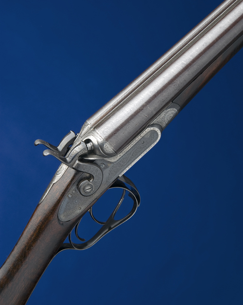 29 3/4in. black powder only damascus barrels (shortened and some pitting), rib engraved 'J. BRADDELL & SON. CASTLE PLACE. BELFAST.', 2 1/2in. chambers, bored approx. true cyl. in both, action incorporating J. Purdey 1863 (second patent) thumbhole underlever, use number 291A, carved percussion fences, rebounding sidelocks with carved faceted fences, fine border and scroll engraving, brushed bright and reblued finish overall, 14in. well-figured stock, insert repair to left underhorn and crack to right underhorn, weight 6lb. 9oz.