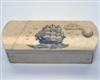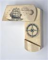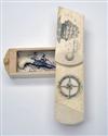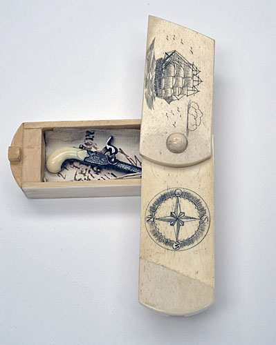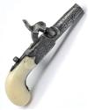 overall length of 1 3/4in. with turn-off barrel, folding trigger and suspension ring to rear of hammer, the action, tang and barrel engraved with scrollwork and floral motifs, swelled ivory butt, the whole in a marine ivory case with concealed latch, the outer lid with a fully-rigged ship under shortened sail in scrimshaw and a compass rose to the inner lid.