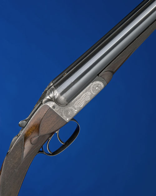 30in. nitro barrels, rib gold-inlaid '2' (inscription indistinct), 2 1/2in. chambers, bored approx. 1/2 choke in both, treble-grip action with removable striker discs, carved stylised leaf fences, automatic safety with gold-inlaid 'SAFE' detail, intercepting sears, best bouquet and acanthus scroll engraving, the makers name engraved within an elaborate cartouche, brushed bright and reblued finish, 14 5/8in. well-figured crossover stock including buttplate, bolstered fore-end wood, weight 6lb. 3oz.