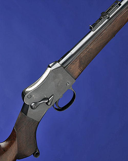 25in. reblued barrel signed 'WESTLEY RICHARD & CO. LONDON' and 'FOR W.R. MARTINI CARTRIDGE', bead fore-sight, rear express sight of one standing and two folding leaves and tangent sight calibrated to 1,000 yards, reblued action signed 'WESTLEY RICHARDS & CO. / LONDON' on the left side and 'MARTINI PATENT' on the right side (lever loose), 14 1/4in. pistolgrip stock with chequered grip and fore-end, sling eyes (some pitting visible beneath blued finish).
