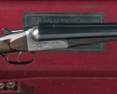 28in. nitro barrels, rib engraved 'ALEX MARTIN. 20 ROYAL EXCHANGE SQUARE. GLASGOW. & 128 UNION ST. ABERDEEN, INCORPORATED WITH ALEX. HENRY & CO. 18 FREDERICK ST. EDINBURGH.', left wall thickness below recommended minimum and loose on action, 2 1/2in. chambers, bored approx. 1/2 and 3/4 choke, treble-grip action, automatic safety with silver-inlaid 'SAFE' detail, bold acanthus scroll engraving with beaded and feathered bordering, retaining traces of colour-hardening, 14 3/8in. highly-figured stock weight 6lb. 6oz., in its lightweight leather case