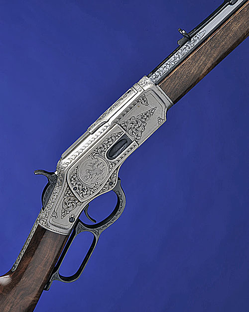 24 1/4in. blued octagonal sighted barrel engraved with scrollwork at the breech and signed 'WINCHESTER 44/40' and 'ONE OF ONE THOUSAND' in gold, action engraved with scrollwork and a vignette on each side respectively of a moose and a bear, 13in. figured stock, scroll engraved blued mounts.