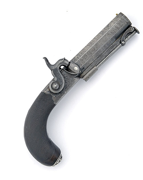 circa 1840, with 4in. octagonal twist sighted barrel signed 'TATHAM LONDON' and engraved with a band at the muzzle, border and scroll engraved action retaining traces of faded case-hardened finish, folding trigger, chequered walnut butt, silver escutcheon and lion-mask butt-cap, iron belt-hook, and iron stirrup ramrod, London proof marks.