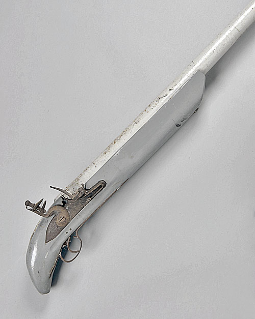 19th century, with 75 1/4in. two-stage barrel with sightly flared muzzle, flintlock mechanism from a British service musket, short wooden tiller stock, the whole with the exception of the lock painted light grey (lock with surface corrosion).