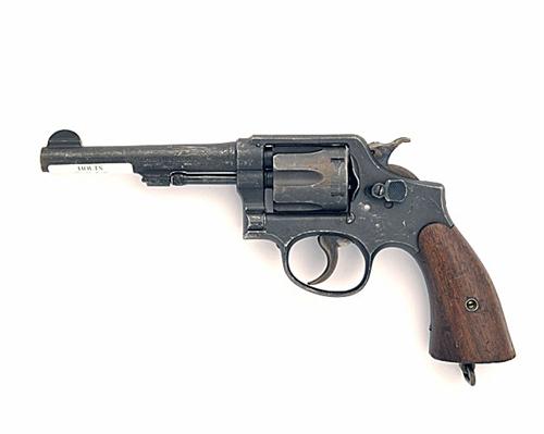 ** A .38 (S&W) SIX-SHOT SERVICE REVOLVER SIGNED 'SMITH & WESSON', MODEL 'M&P', serial no. V74372, circa 1941, with 5in. sighted barrel (proved 2011), frame marked 'UNITED STATES PROPERTY', fluted swing-out cylinder and smooth walnut grips, parkerised grey wartime finish
