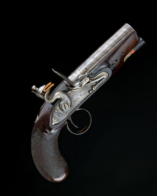 * AN 18-BORE FLINTLOCK OVERCOAT PISTOL SIGNED JOHN RIGBY, DUBLIN,