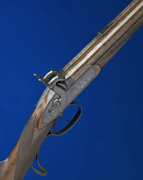 with 30in. rebrowned twist barrels signed 'I. HOLLIS & SONS. LONDON' on the rib (rib raising), blade fore-sight, rear-sight of one standing and three folding leaves, border engraved breeches, tang and bolted locks, the last each signed 'I. HOLLIS & SONS', figured walnut half-stock (left side of fore-end chipped on edge) with chequered grip and fore-end, border engraved iron mounts including pistolgrip trigger-guard and hinged patchbox-cover, silver escutcheon, sling eyes, and shortened brass-tipped ramrod, probably original (iron parts discoloured throughout), Birmingham proof marks.