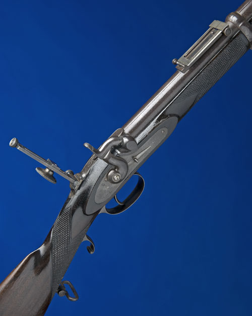 with 33in. barrel marked 'WHITWORTH PATENT' towards the breech, Whitworth patent adjustable tangent rear-sight, later windage adjustable fore-sight and aperture rear-sight, border engraved recessed breech, border engraved bolted detented lock signed 'WHITWORTH' and with wheatsheaf trademark on the tail, walnut three-quarter stock with chequered grip and fore-end, border engraved iron mounts including pistolgrip trigger-guard and hinged patchbox-cover, iron sling mounts, iron ramrod (iron parts discoloured throughout), Birmingham proof marks.