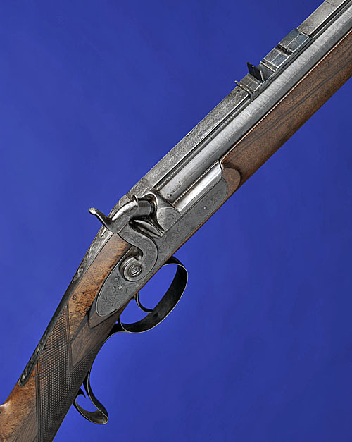 with heavy octagonal twist barrel with full length wide raised rib graduated from '1' to '20' and signed 'PRYSE & REDMAN. 130 PICCADILLY. LONDON', blade fore-sight, rear-sight of one standing and four folding leaves, border and scroll engraved recessed breech, tang and lock, the last signed 'PRYSE & REDMAN', figured walnut half-stock (cracked through with insert repair at the wrist), chequered grip, iron mounts including border and scroll engraved pistolgrip trigger-guard (patchbox possibly a later addition), silver escutcheon, horn fore-end cap, sling eyes, and later ramrod (some discolouration to iron parts), London proof marks.