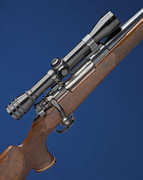 24in. blued nitro barrel (proved in 2010), fitted with a Redfield 4x telescopic sight, 13 3/4in. figured pistolgrip stock including 1in. rubber recoil pad, schnabel fore-end, chequered grip and fore-end with scroll carved borders, the fore-end inlaid with diamond pattern