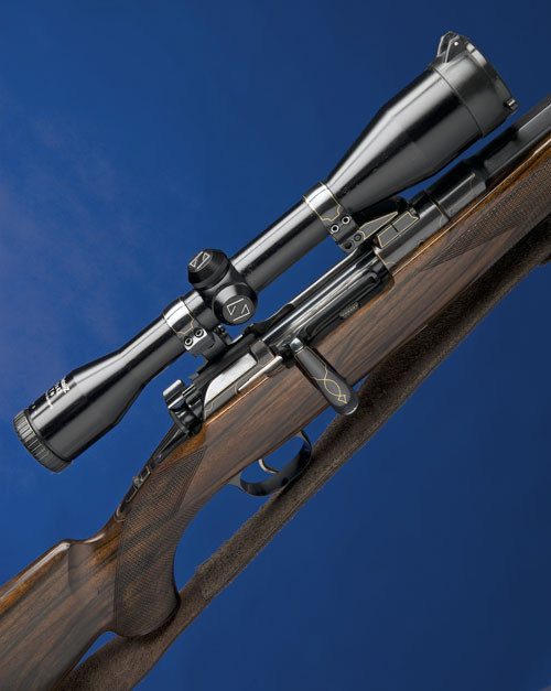 24 3/4in. blued nitro octagonal to round sighted barrel with gold-inlaid lines at the muzzle and breech and signed 'DAN'L. FRASER & CO. CROMARTY. THE BLACK ISLE. SCOTLAND', blued receiver decorated with further gold-inlaid lines, fitted with a Zeiss Diatal-Z 6x42 telescopic sight in quick detachable mounts decorated en suite with the receiver, 15in. figured pistolgrip stock including 5/8in. chequered dark horn butt-plate, raised cheek-piece, chequered grip and fore-end, blued pistolgrip-cap, magazine floor-plate and trigger-guard each decorated with gold-inlaid lines, the last also with gold-inlaid serial number, dark horn fore-end cap, gold escutcheon engraved with initials, and brown leather sling in quick detachable mounts.